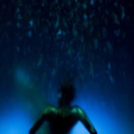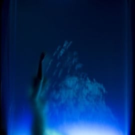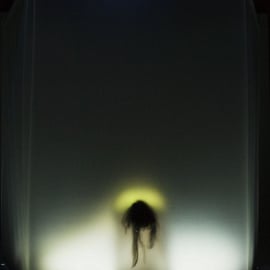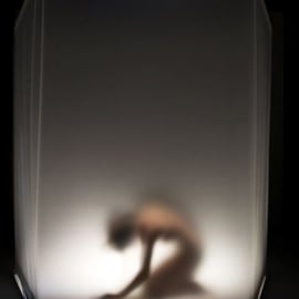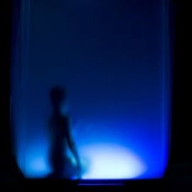 L'interprète est seulement perçue à travers une structure translucide sur laquelle un vidéo projecteur zénithal projette des textures.
